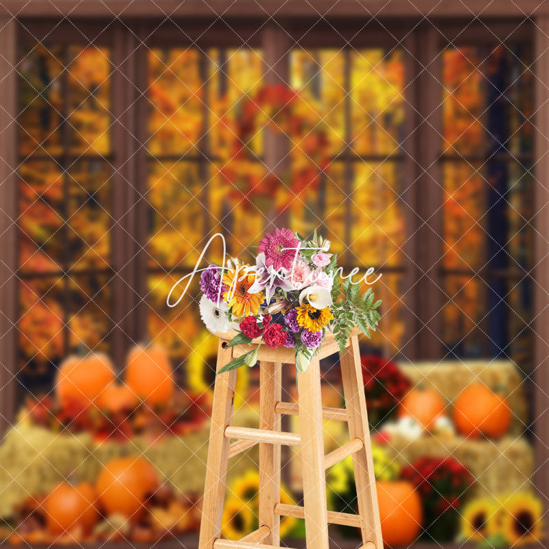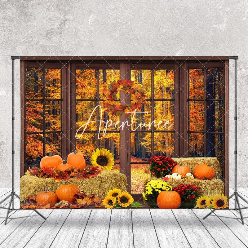 Aperturee Autumn Haystack Pumpkins Window Sunflower Backdrop