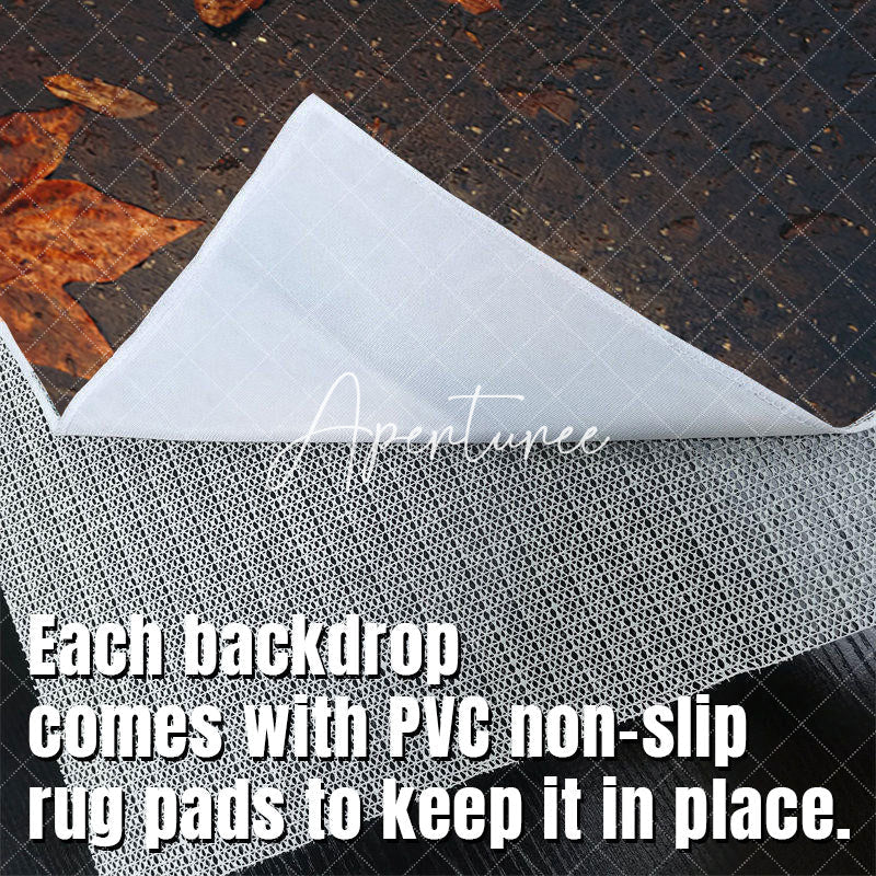 Like our photography backdrops, the fabric floor backdrops also use microfiber cloth to make, it is wrinkle free, soft and seamless, foldable storage. The PVC non-slip rug pads are made from innovative PVC latex, this makes our pads soft, skid-resistant, eco-friendly, hygienic, and easy to clean.