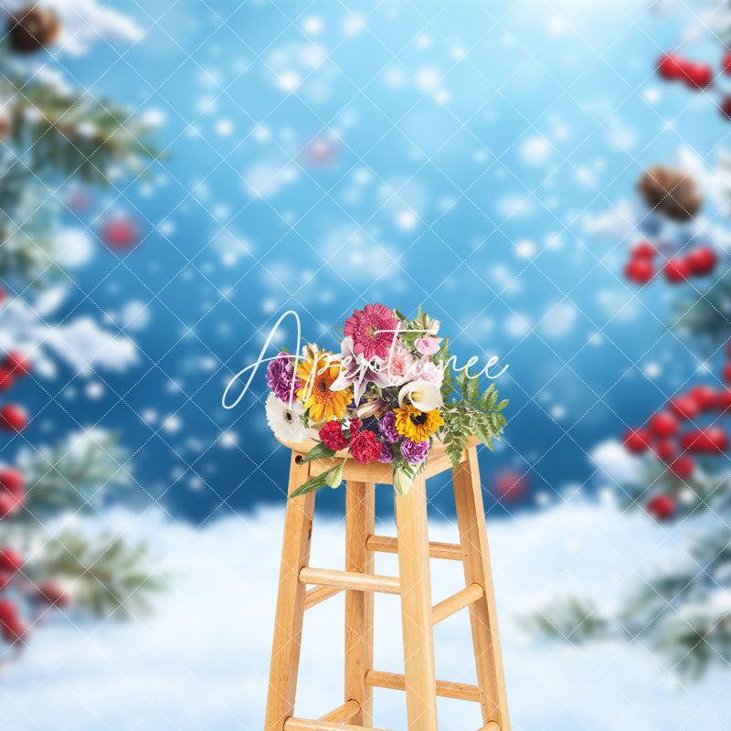 Aperturee Blue Bokeh Snow Cherry Pine Leaves Christmas Backdrop