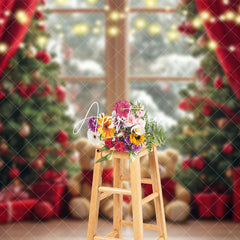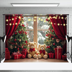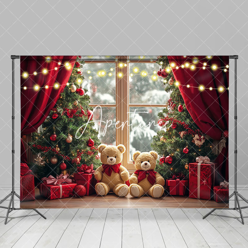 Aperturee Blurry Window Red Curtain Bear Christmas Backdrop
