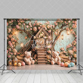 Aperturee Pink Dense Floral Tree House Bear Cake Smash Backdrop