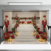 Aperturee Grand Christmas Staircase Photography Backdrop, Nutcrackers and Poinsettia Decor, Elegant Holiday Background