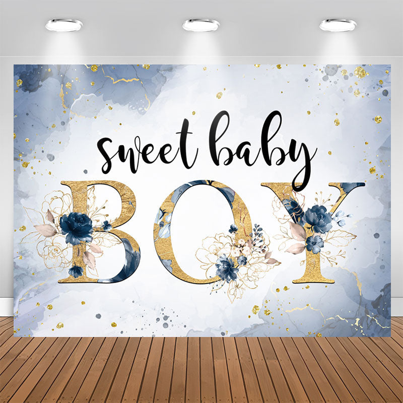 Sweet Baby Boy Marble Floral Blue Baby Shower Backdrop