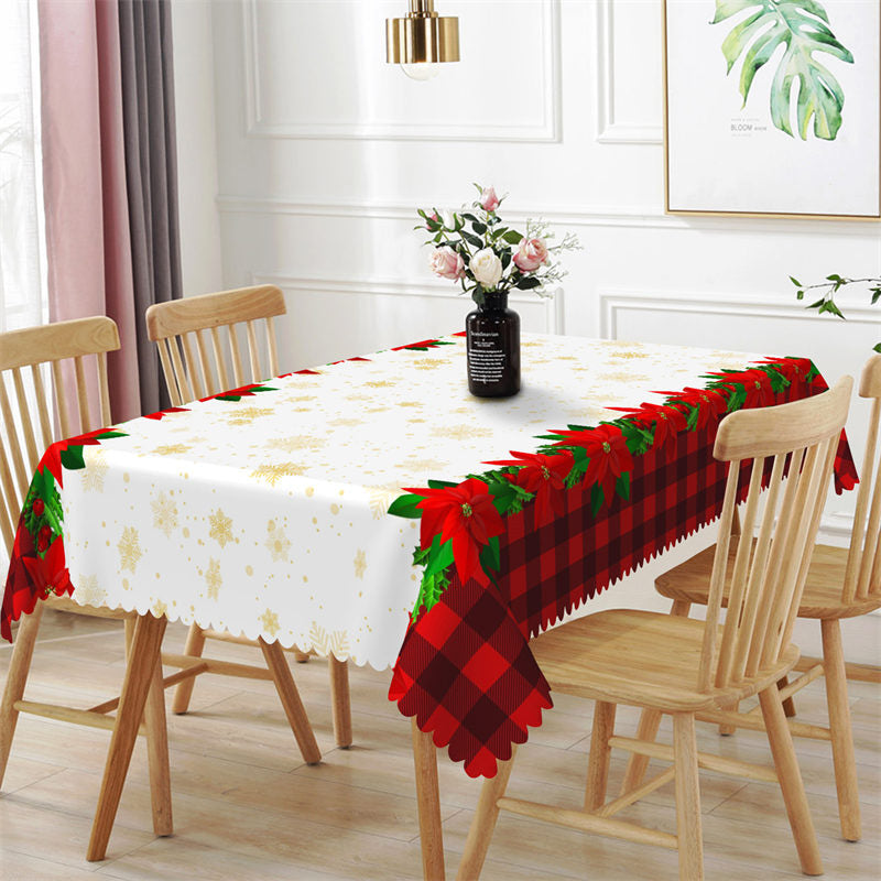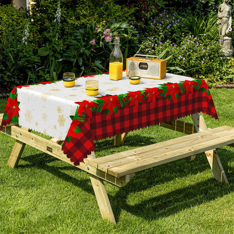 Gold Snowflake Red Floral Plaid Christmas Tablecloth