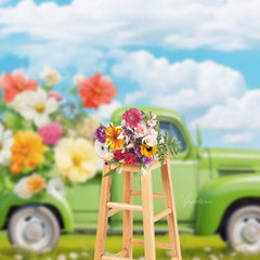 Green Truck Full Of Flowers Blue Sky Spring Backdrop