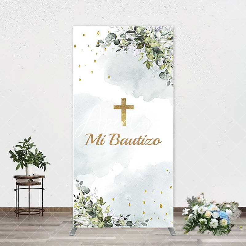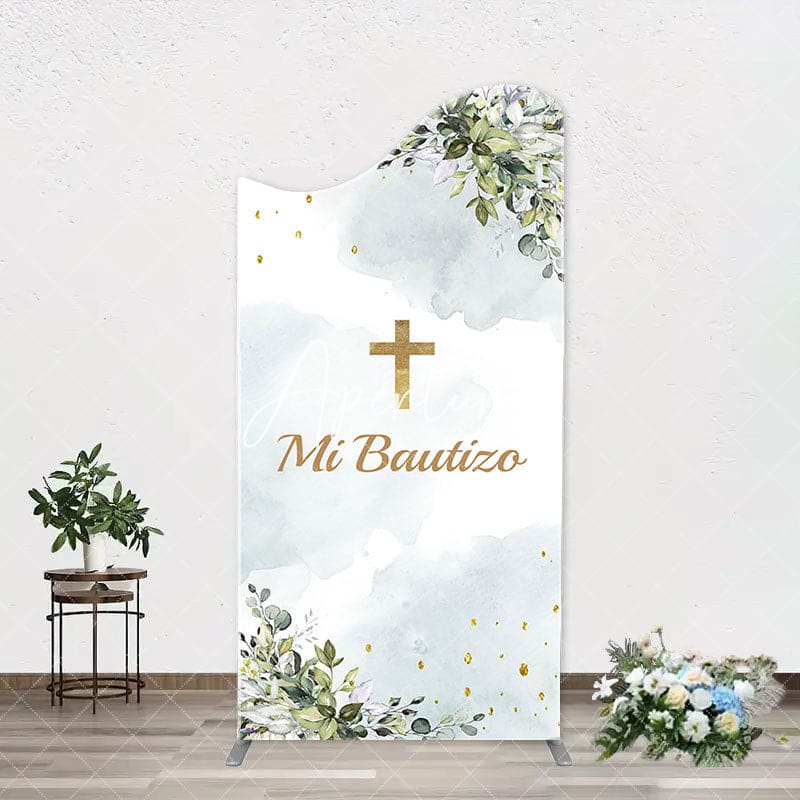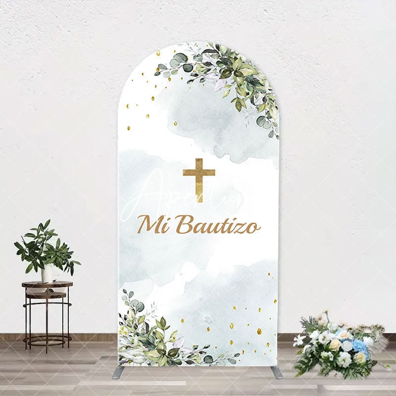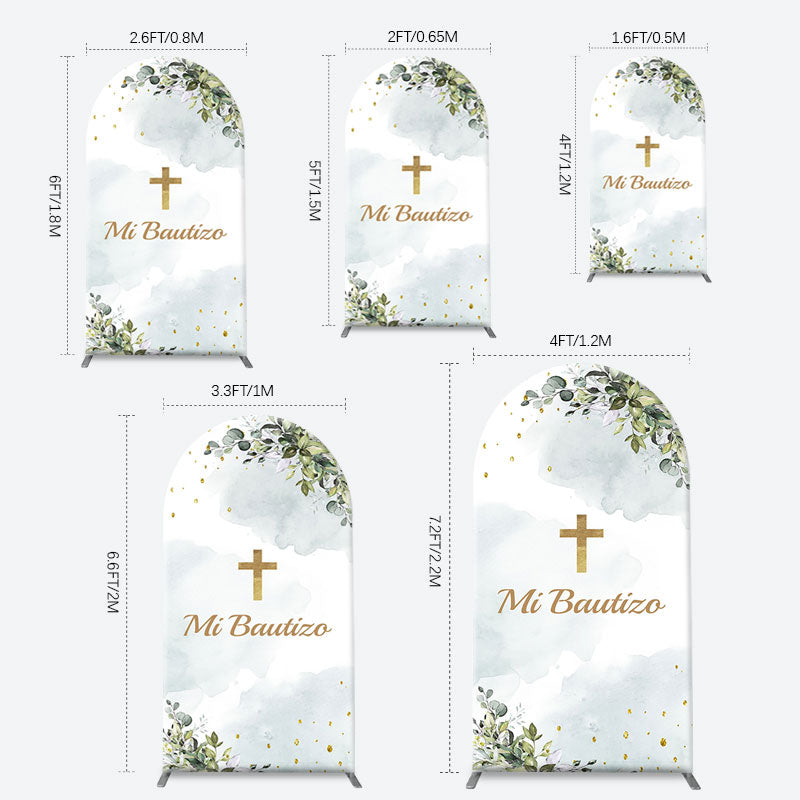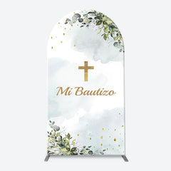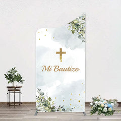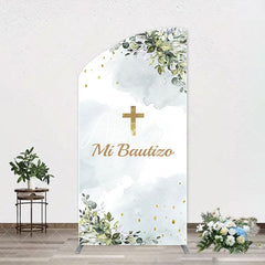 Mi Bautizo Gold Cross Leaves Arch Baptism Backdrop