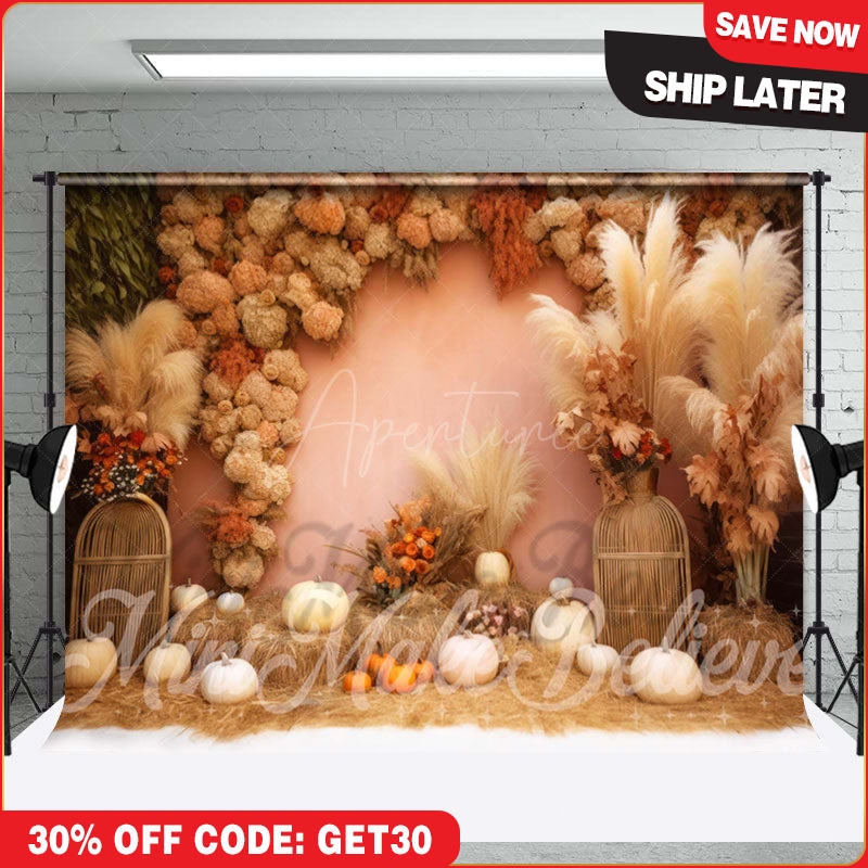 (Ship In 24HR) Boho Floral Bulrush Pumpkin Photo Booth Backdrop