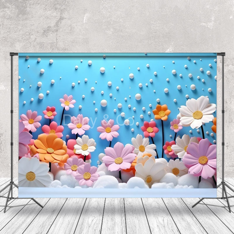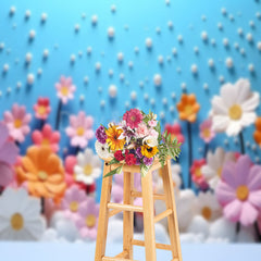 Blue Wall Colorful Flowers Cake Smash Backdrop Kids