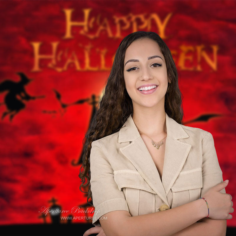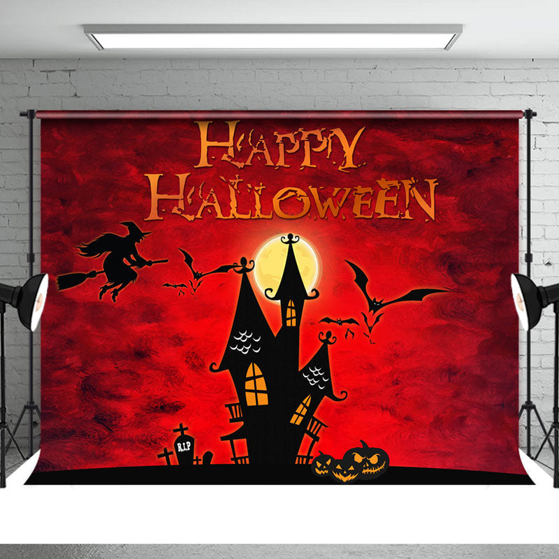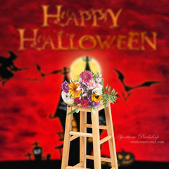 Spook House Bat Pumpkin Moon Red Halloween Backdrop