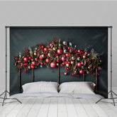 Aperturee Elegant Christmas Headboard Photography Backdrop, Red and Silver Ornaments with Berries, Holiday Bedroom Photo Prop