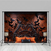 Aperturee Gothic Halloween Headboard Photography Backdrop, Spooky Spiderweb Bed with Orange Pillows, Haunted Bedroom Decor