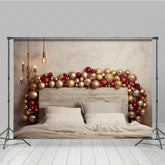 Aperturee Christmas Headboard Photography Backdrop, Red Gold and Silver Ornament Garland, Elegant Holiday Bedroom Photo Prop