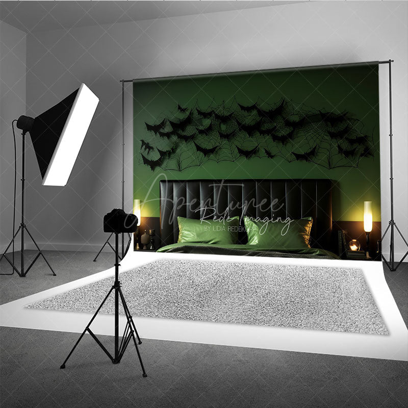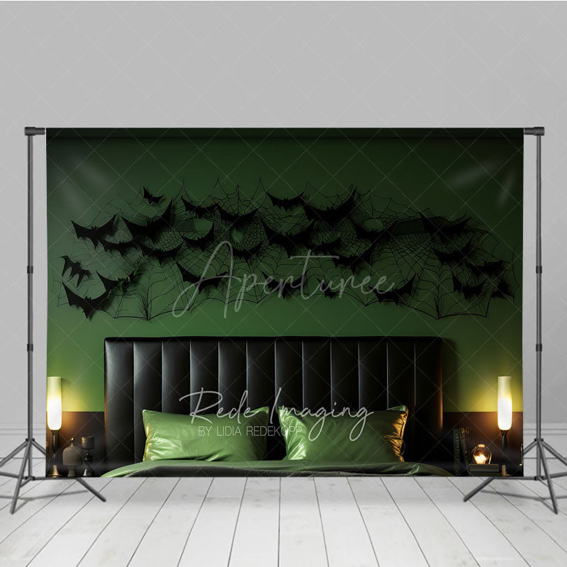 Aperturee Modern Halloween Headboard Photography Backdrop, Green Wall with Black Bats and Spiderwebs, Spooky Bedroom Decor
