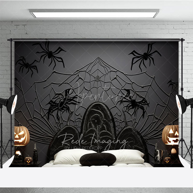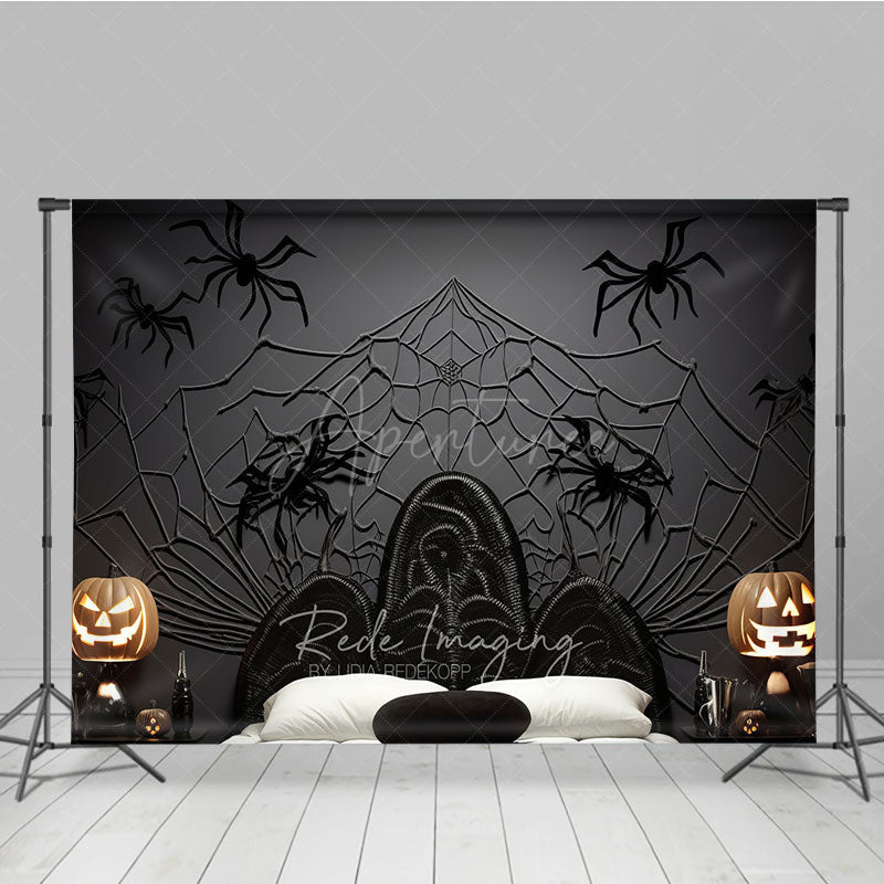 Aperturee Spooky Spiderweb Headboard Photography Backdrop, Black Wicker Bed and Jack O' Lanterns, Halloween Photo Prop