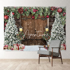 Xmas Tree Red Baubles Wood Door Snowy Backdrop
