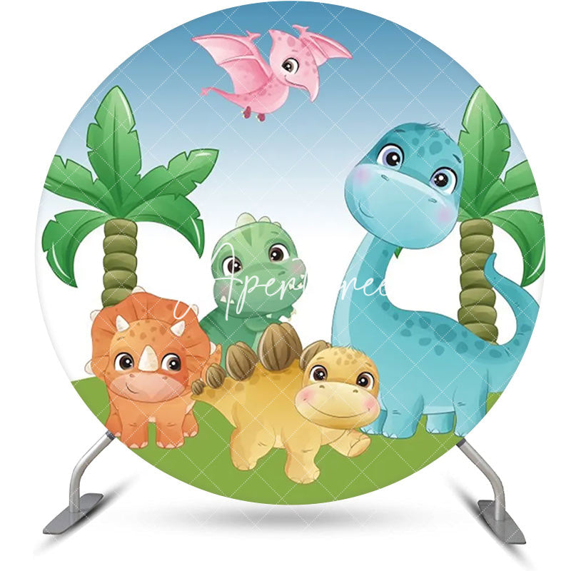 Palm Trees Colorful Baby Dinosaurs Round Backdrop
