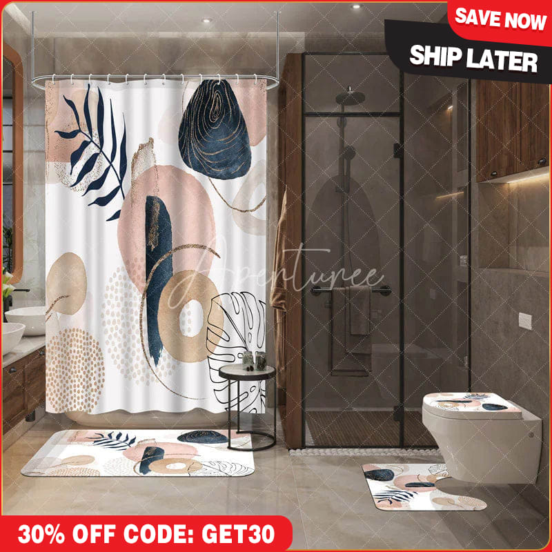 Includes: 1pc shower curtain 72x72in, 1pc toilet lid cover 17.7x13.8in, 1pc bath mat 17.7x14.8in, 1pc non-slip rug 29.5x17.7in, and 12pcs hooks for quick and secure installation.