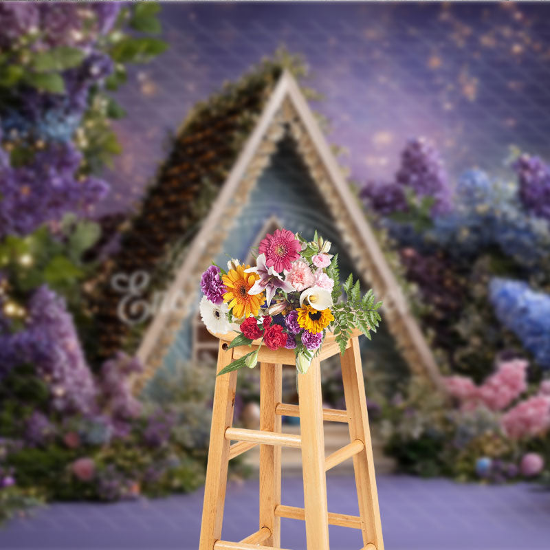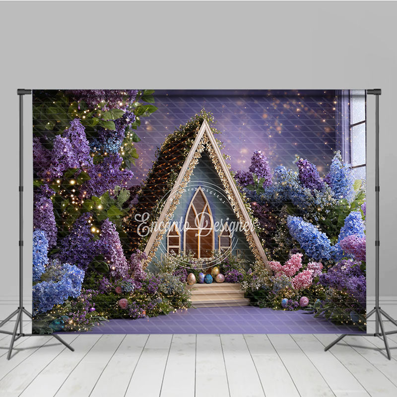Aperturee Purple and Blue Floral A-Frame House Photography Backdrop, Twinkling Lights Easter Eggs Decor for Studio