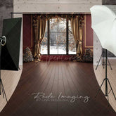 Aperturee Christmas Window Sweep Photography Backdrop with Wood Floor, Elegant Room with Snowy View, Holiday Portrait Studio Prop