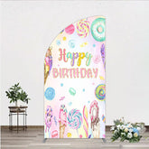 Aperturee Happy Birthday Candyland Half Moon Arch Backdrop, Pastel Donut, Ice Cream and Lollipop, Sweet Shoppe Party Photo Booth