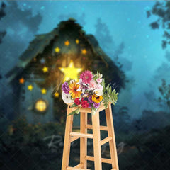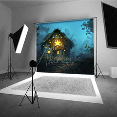 Aperturee Fairytale Forest Cabin Photography Backdrop, Whimsical Cottage with Glowing Stars, Enchanted Woods at Night Prop
