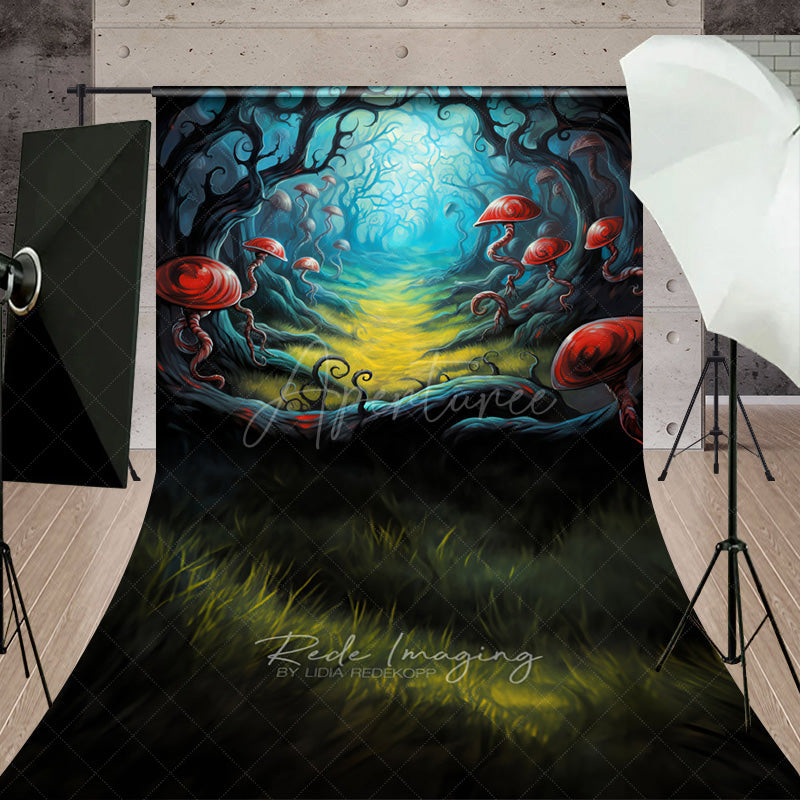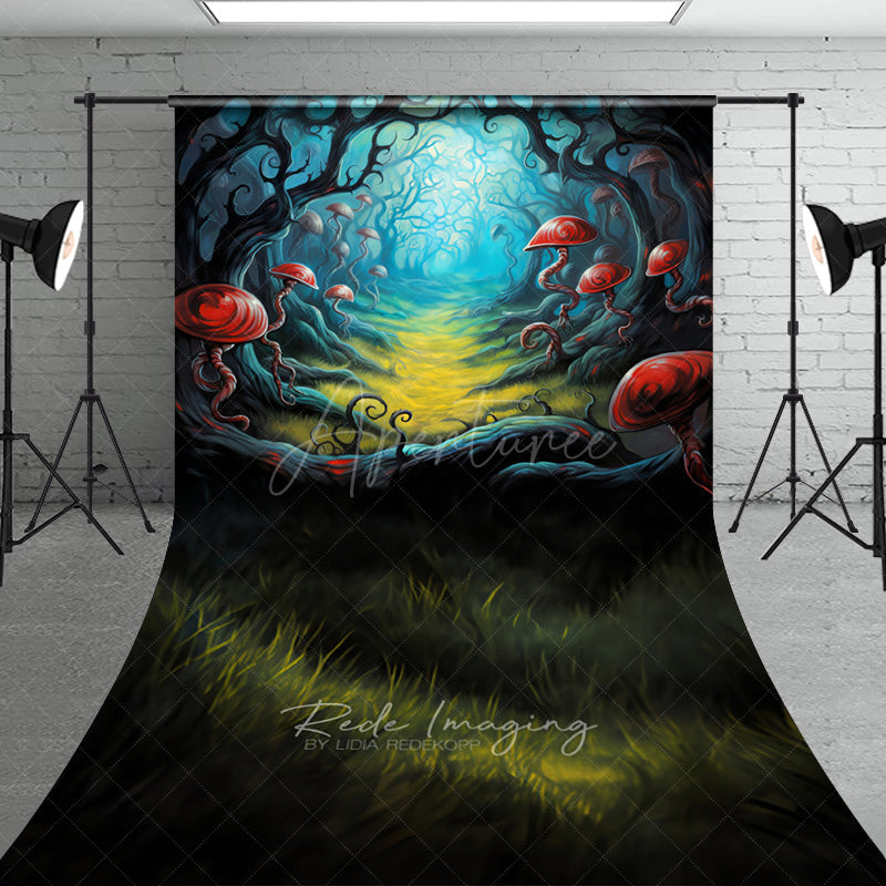 Aperturee Fairytale Mushroom Forest Sweep Photo Backdrop, Whimsical Red Fungi Path, Enchanted Woods Scenery Photo Prop