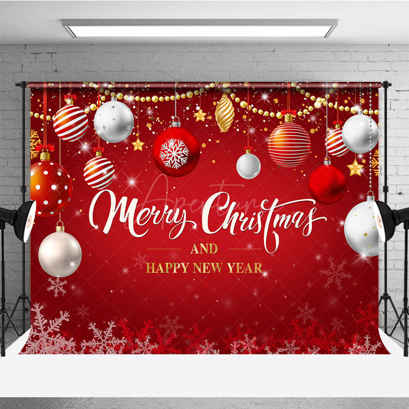 Aperturee Merry Christmas and Happy New Year Backdrop, Red and Gold Ornaments, Winter Holiday Party Photo Booth Decor