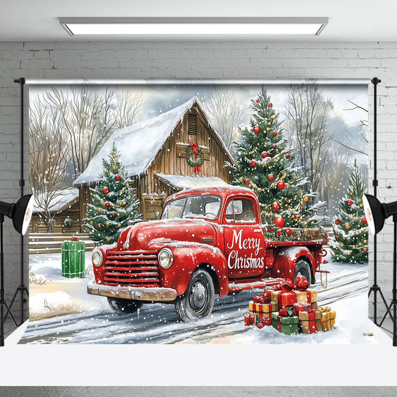 Aperturee Snowy Winter Wild Road Red Truck Christmas Backdrop