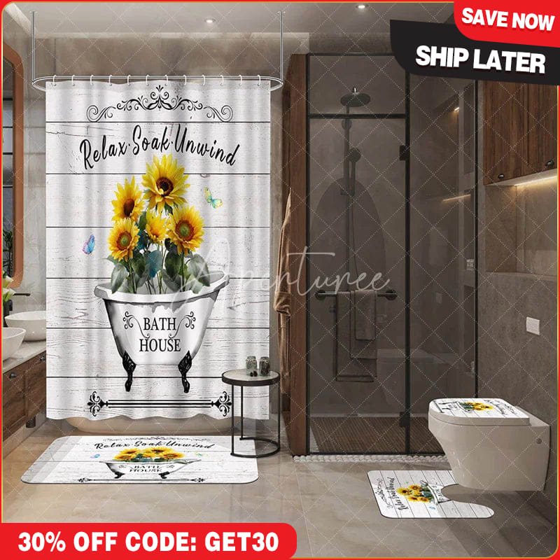 Aperturee 4-Piece Rustic Sunflower Bathroom Set, Farmhouse Bathtub Wood, Yellow Relax Soak Unwind Decor