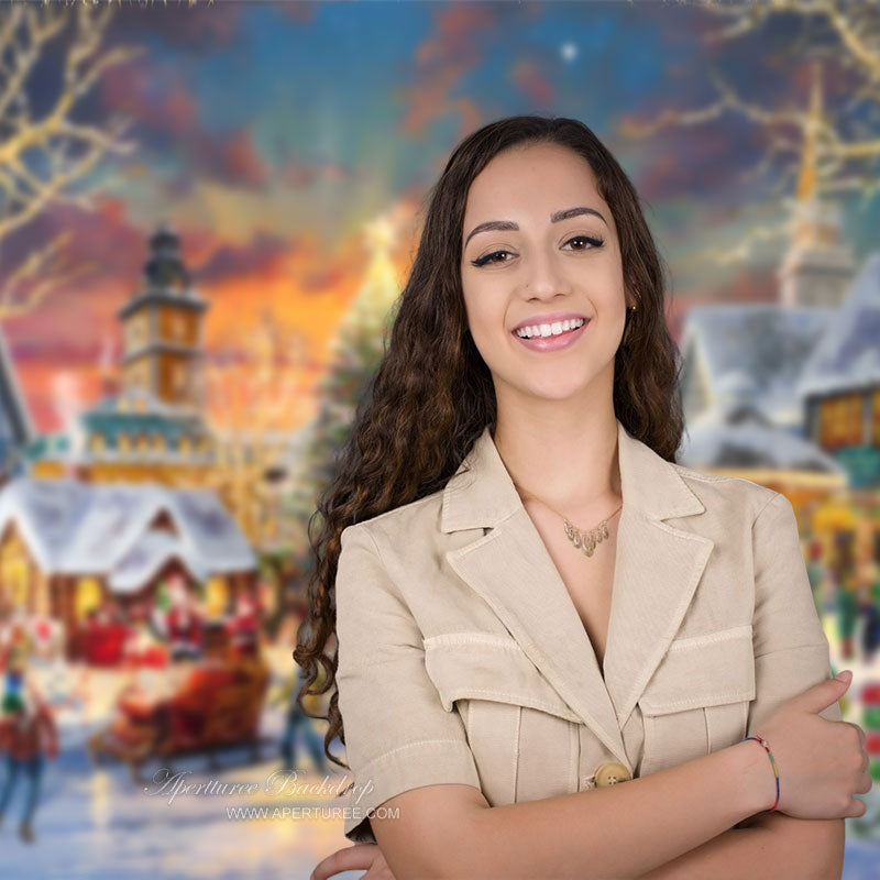 Painting Santa Carriage Christmas Tree Town Backdrop